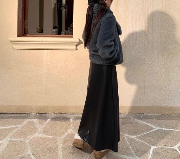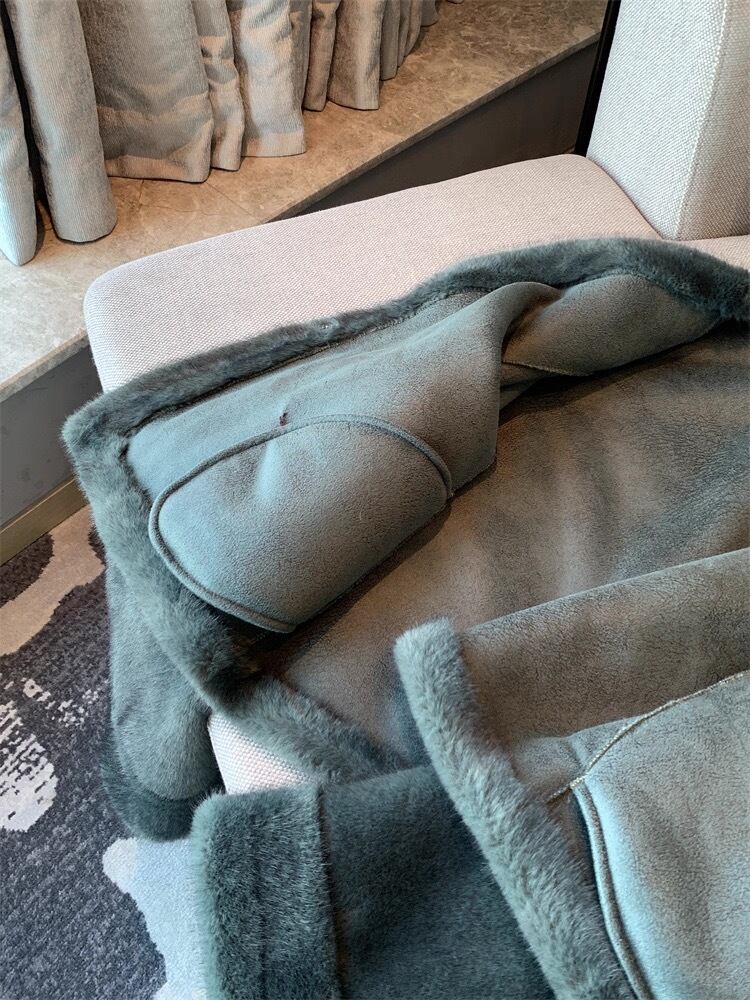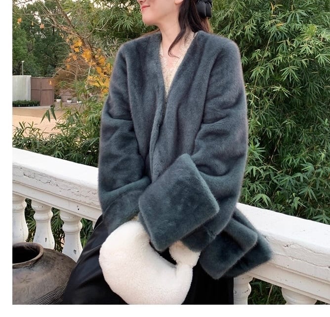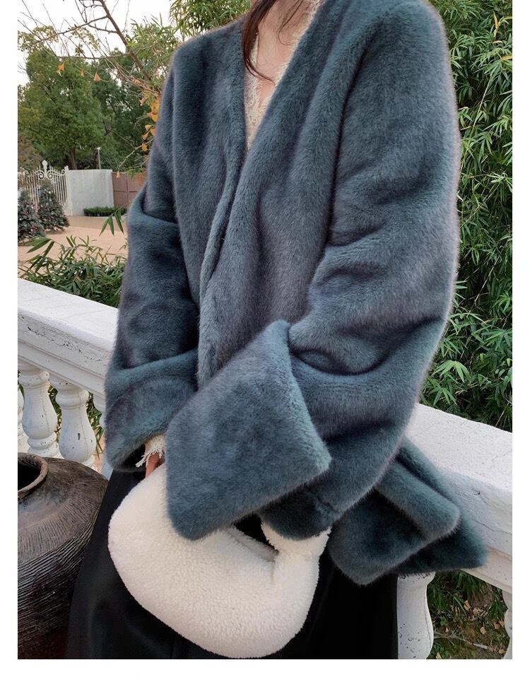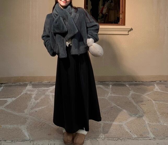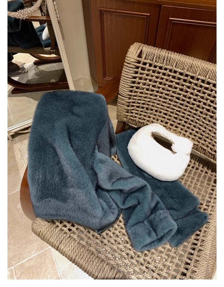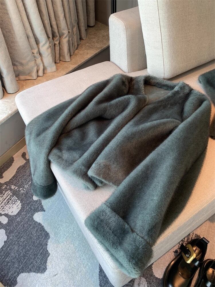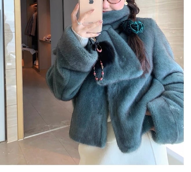 くすみグリーンカラーがとても素敵で、ミンク調のエコファーが高見えするマフラー次の日ショート丈コートです★