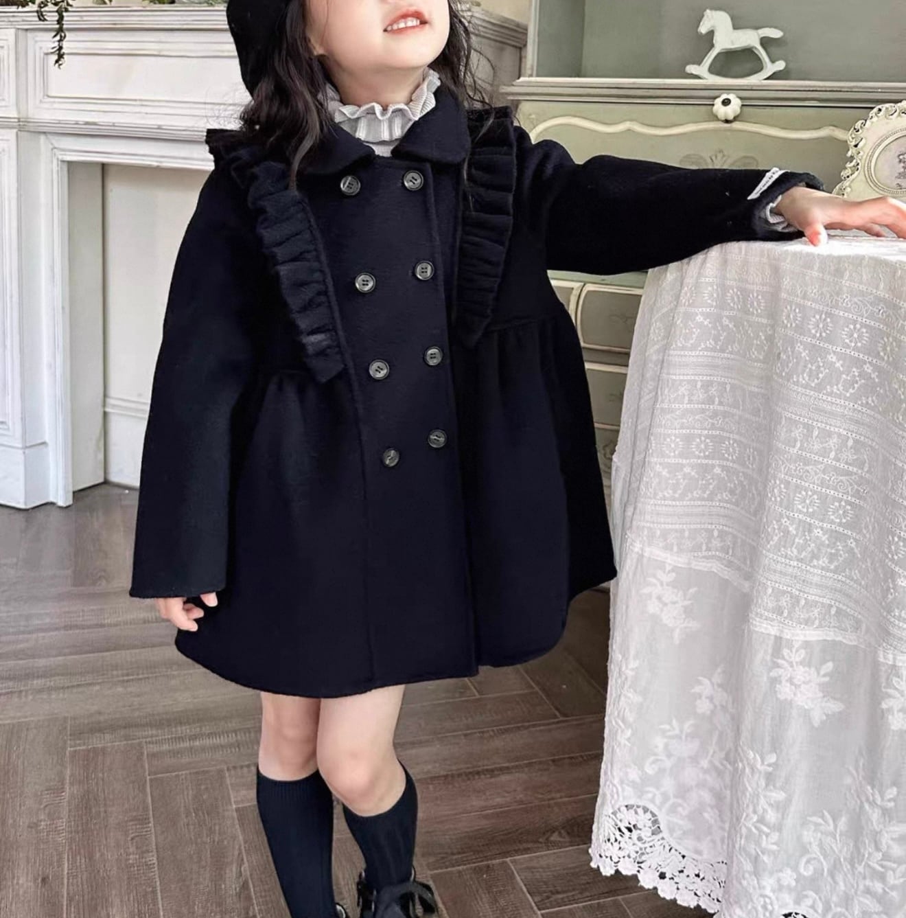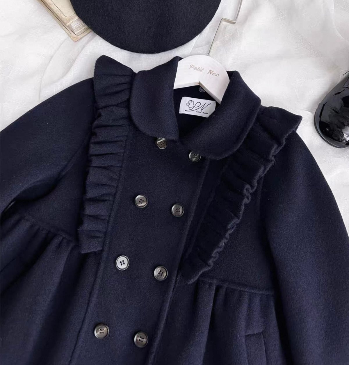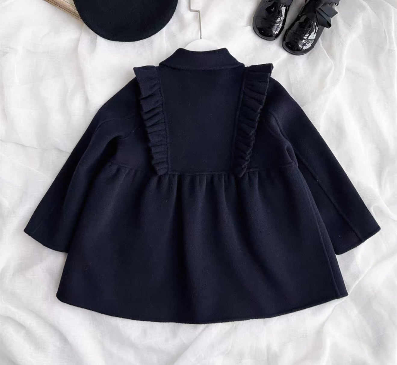 ウール100%で暖かくフロントとバック共にフリルがあしらわれた濃紺カラーのスクールコートです★