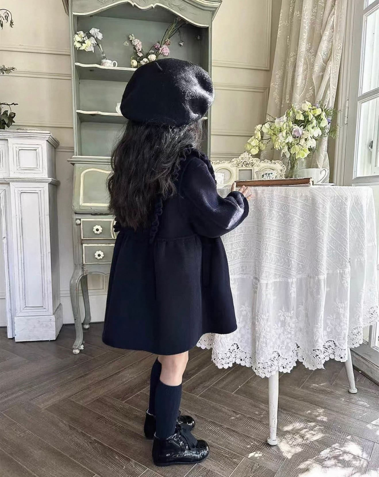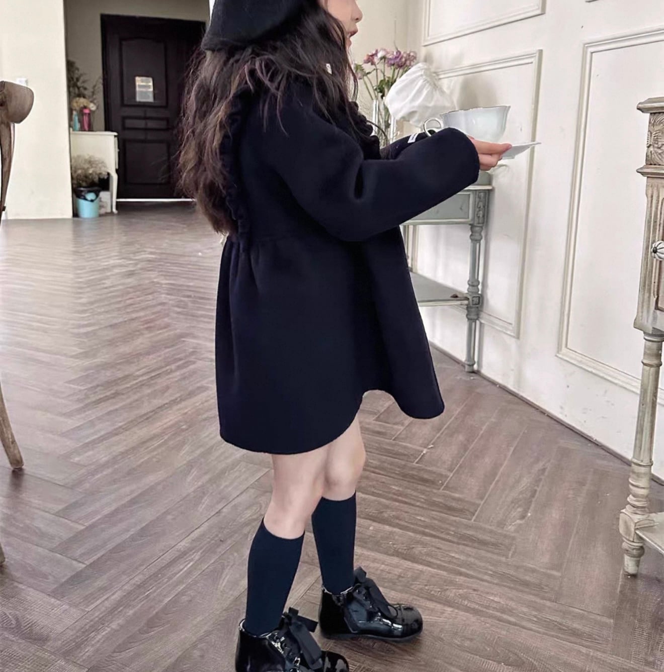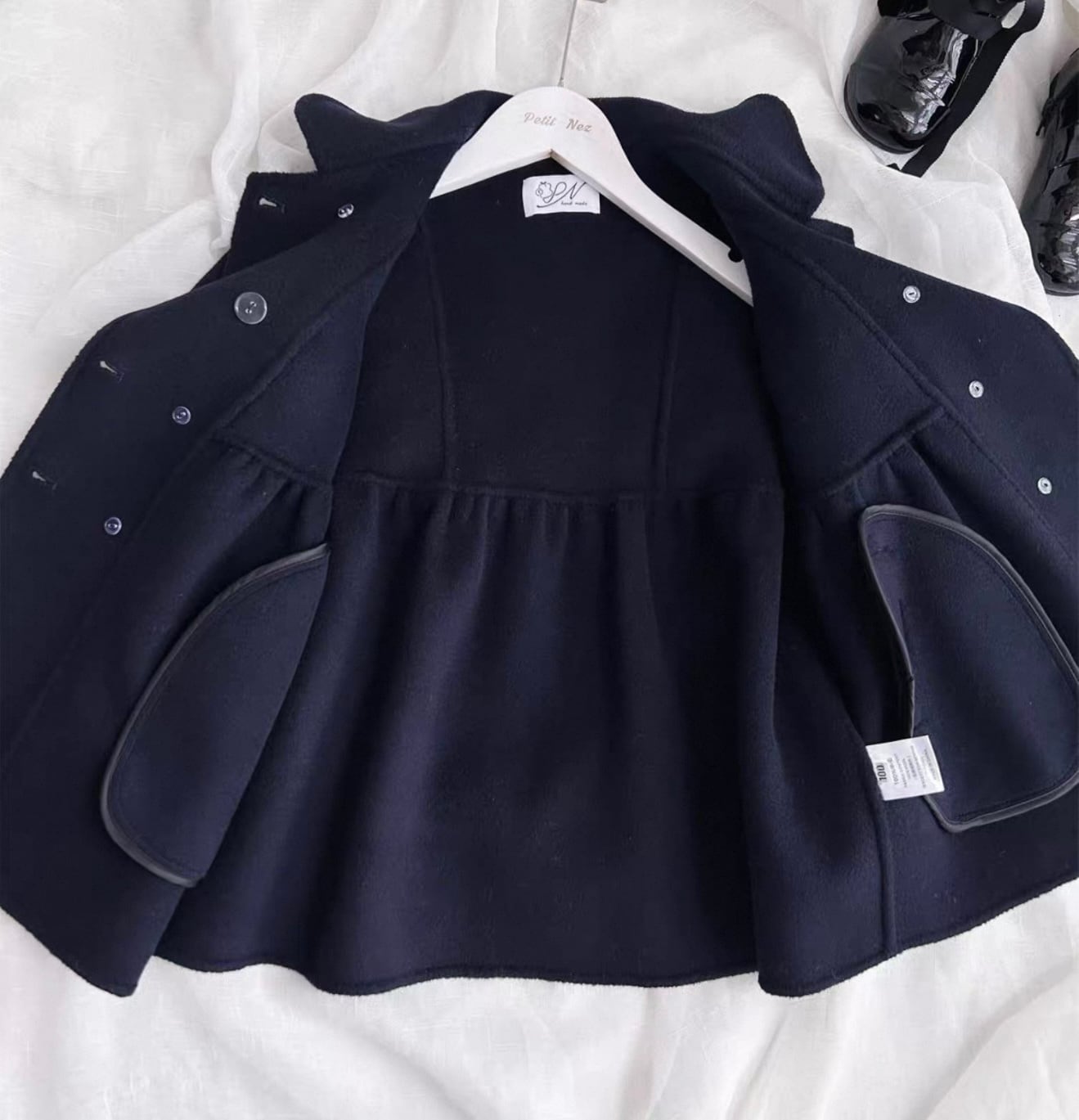ウール100%で暖かくフロントとバック共にフリルがあしらわれた濃紺カラーのスクールコートです★