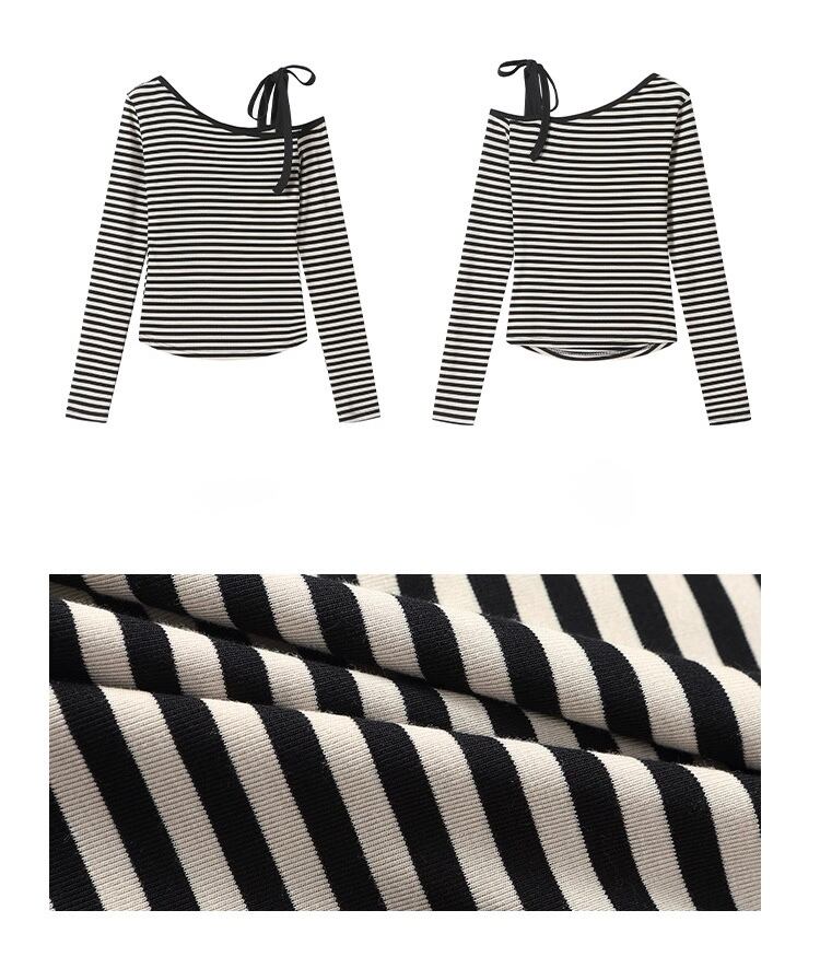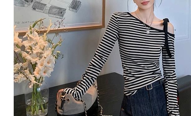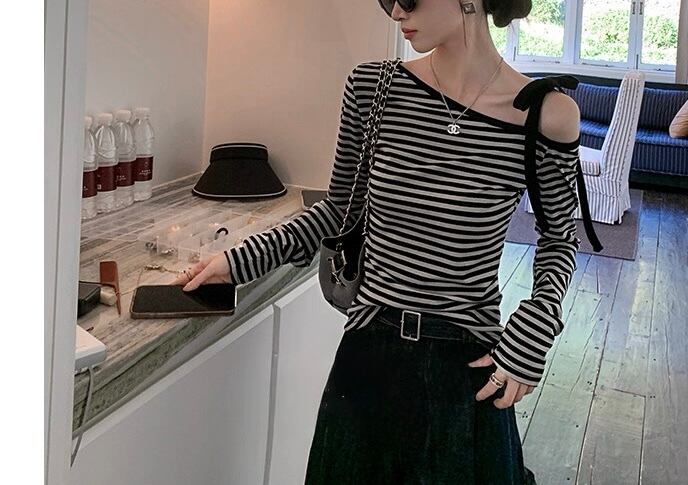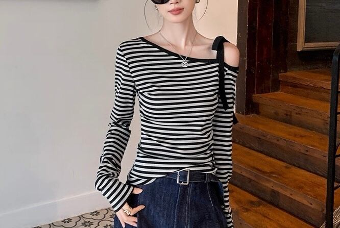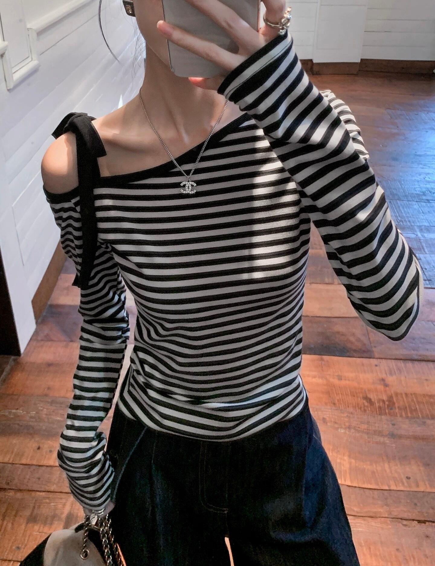 カジュアル過ぎないワンショルデザインが可愛いボーダーワンショルリボンロングスリーブTシャツです☆