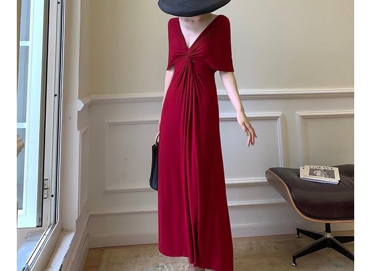 Vネック部分がツイストされた上品で楽ちんなロングワンピースです☆