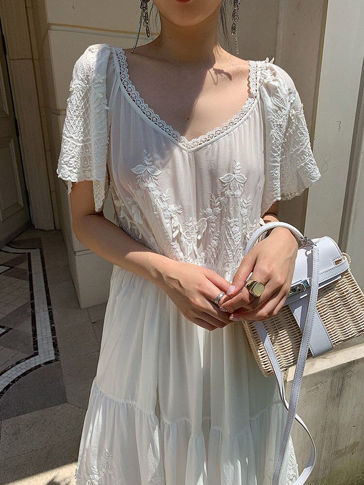 レース刺繍がふんだんにあしらわれた高級感あるホワイトロングワンピースです☆