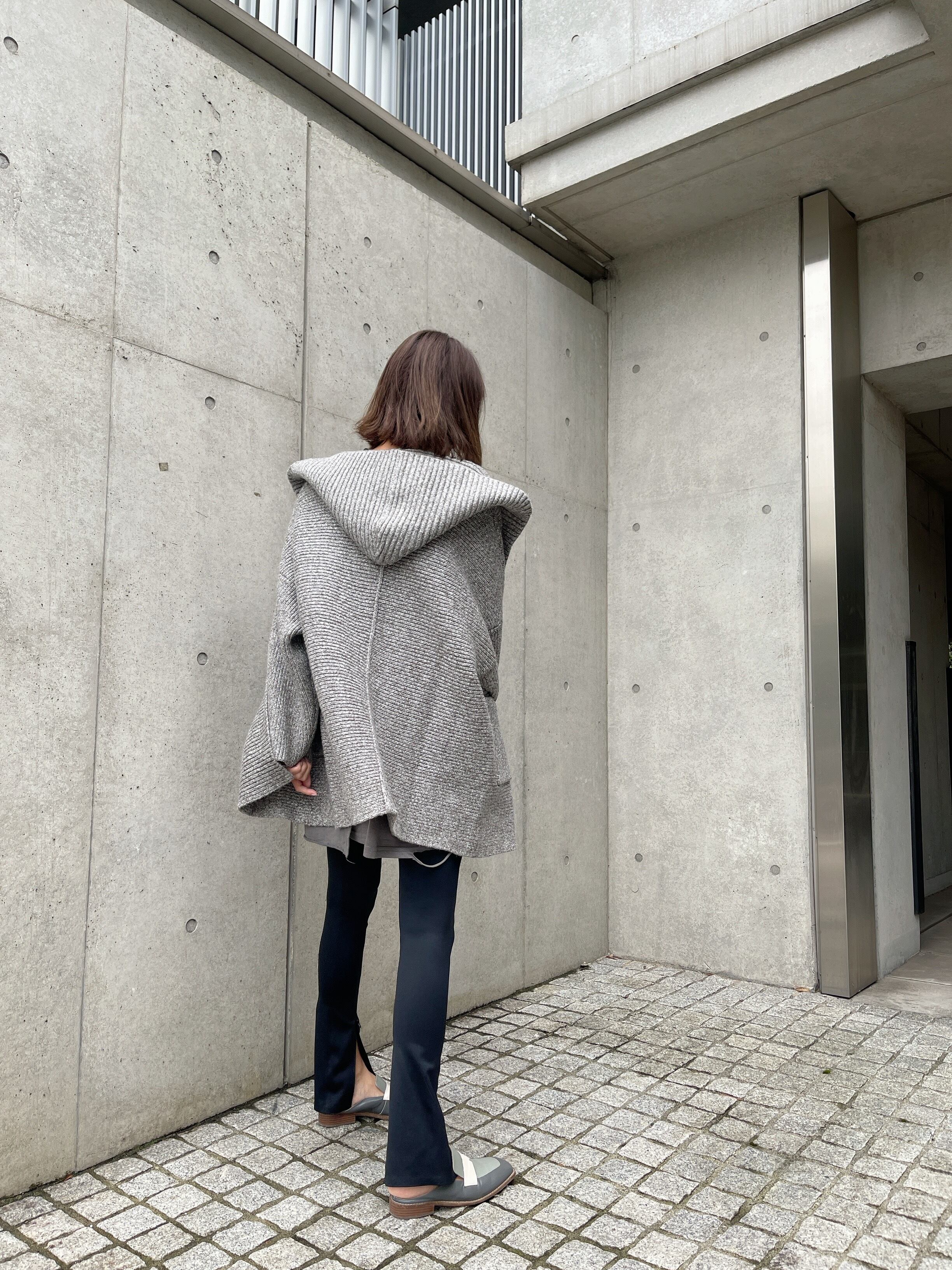 ジップアップ開けると細身のフレアパンツ