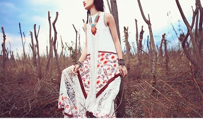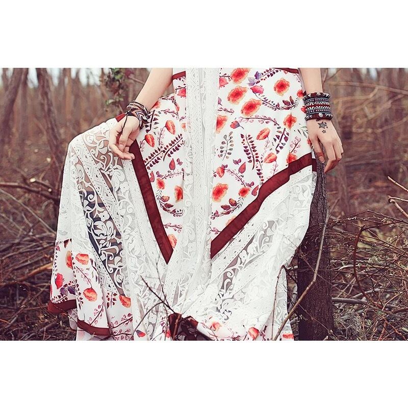 鮮やかなエスニック花柄とレースのコンビが可愛いマキシワンピースです☆